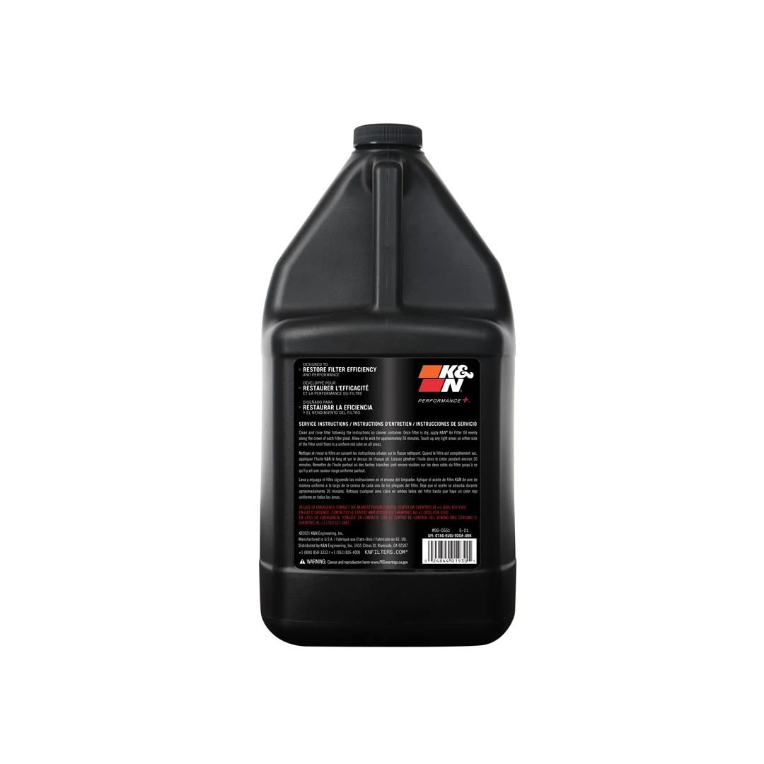 K&N 99-0551 is a 1 US gallon container of air filter oil. K&N Air Filter Oil is the only oil specially formulated to work in combination with the cotton fabric in K&N air filter elements providing a superior air filtration system. When used as directed, it quickly penetrates the filter pleats, where it remains suspended in the cotton fabric. Saturation is maintained until the element is cleaned with K&N Air Filter Cleaner.