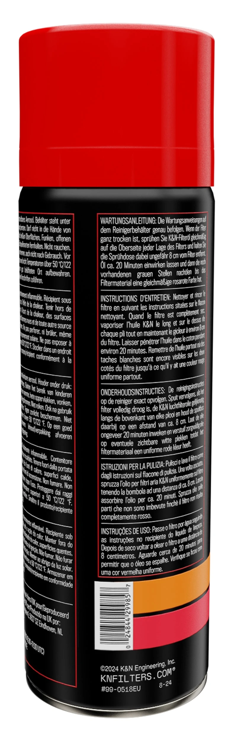 K&N 99-0518EU is a 408 milliliter aerosol can of air filter oil. K&N Air Filter Oil is the only oil specially formulated to work in combination with the cotton fabric in K&N air filter elements providing a superior air filtration system. When used as directed, it quickly penetrates the filter pleats, where it remains suspended in the cotton fabric. Saturation is maintained until the element is cleaned with K&N Air Filter Cleaner. Bottle is labeled in German, French, Dutch, Italian and Portuguese for use in Europe.