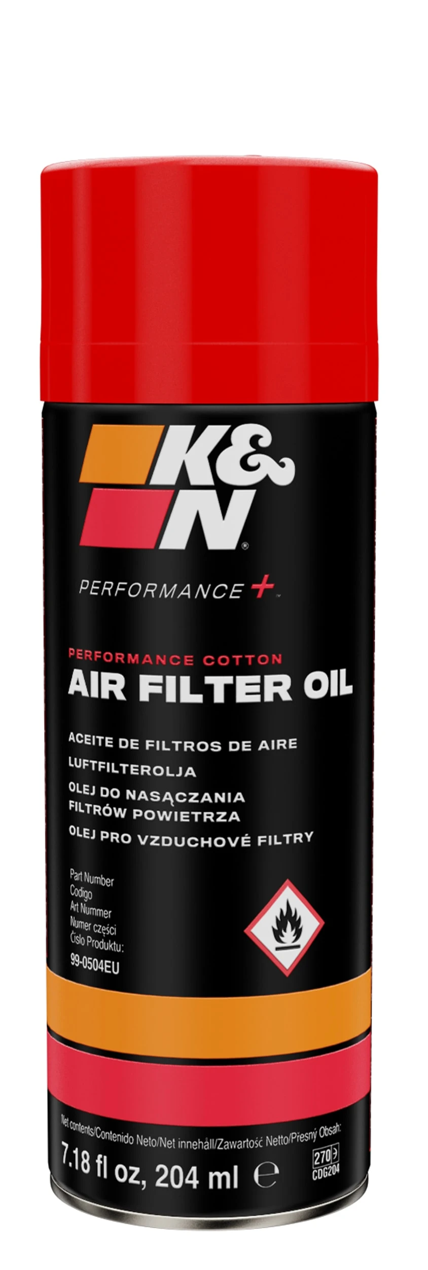 K&N 99-0504EU is a 204 milliliter aerosol can of air filter oil. K&N Air Filter Oil is the only oil specially formulated to work in combination with the cotton fabric in K&N air filter elements providing a superior air filtration system. When used as directed, it quickly penetrates the filter pleats, where it remains suspended in the cotton fabric. Saturation is maintained until the element is cleaned with K&N Air Filter Cleaner. K&N 99-0504EU air filter oil is labeled in English, Spanish, Swedish, Polish and Czech for use in the European Union.