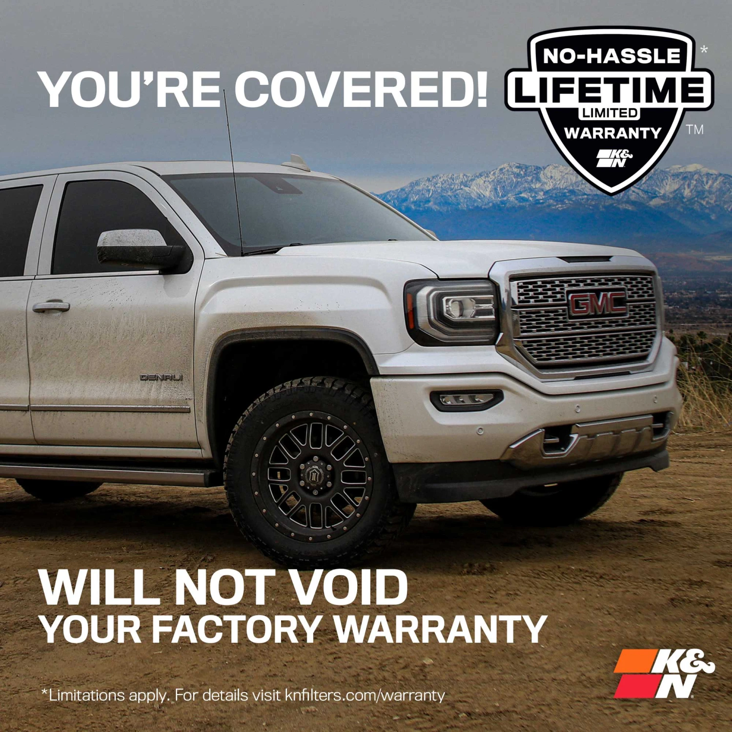 - PREMIUM ENGINE PROTECTION FROM A TRUSTED BRAND: K&N air intake will not void manufacturer vehicle warranty & No-Hassle Lifetime Limited Warranty protects for the life of your vehicle.