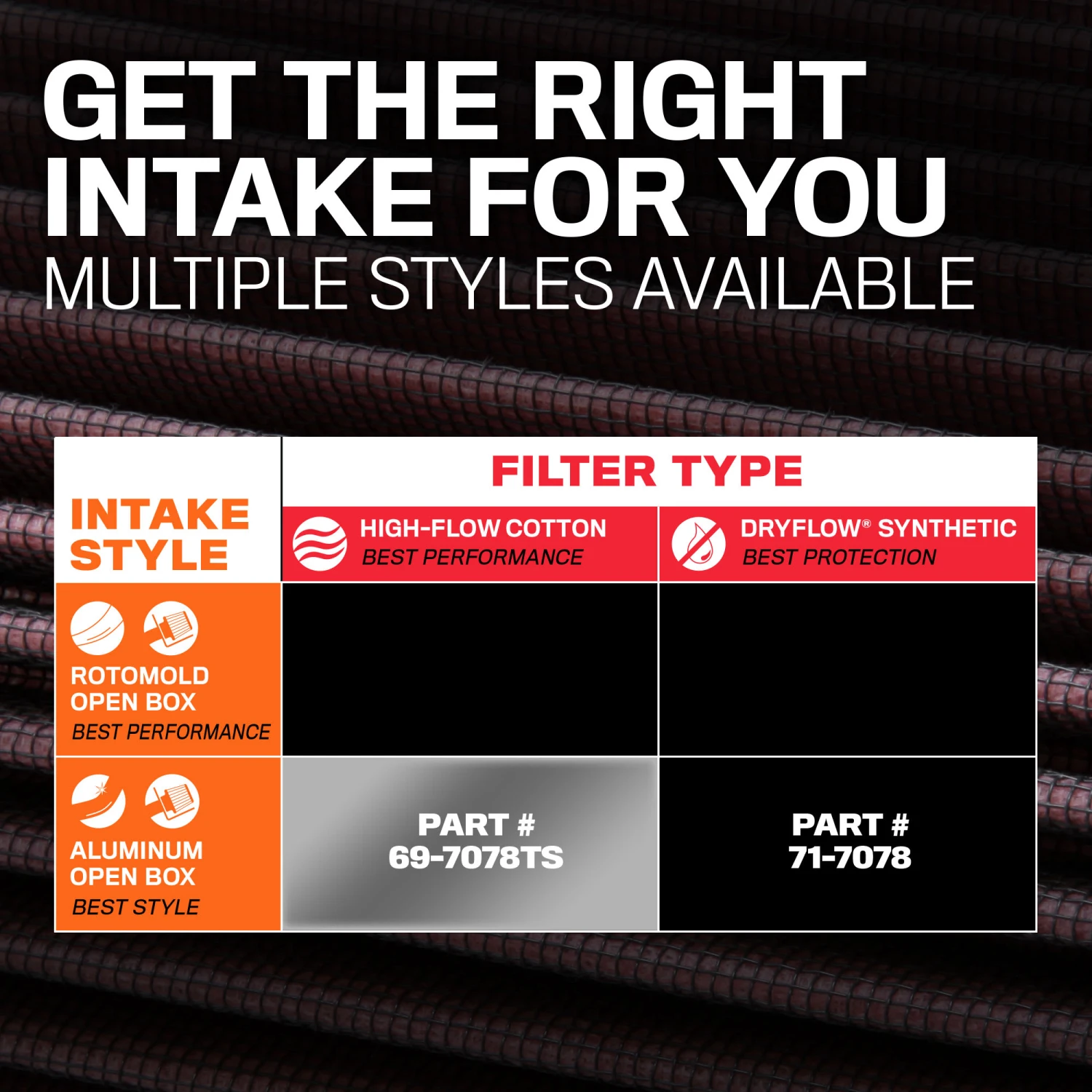 - Mandrel-bent aluminum intake tube paired with oversized oiled cotton air filter.