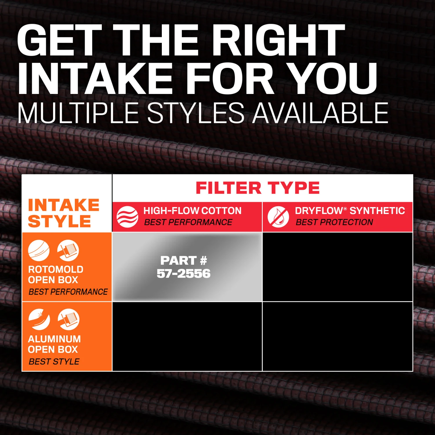 A high-density polyethylene (HDPE) rotationally-molded tube helps increase the volume of airflow to your engine, and provides a guaranteed increase in horsepower and torque. These systems are paired with a washable, reusable High-Flow Air Filter™ featuring oiled cotton filter media. The oversized, conical design allows you to go up to 100,000 miles between filter services under normal highway driving conditions. A custom heat shield helps protect intake air from the high temperature of your engine bay, and the entire system can typically be installed in less than 60 minutes.